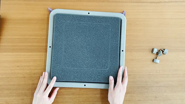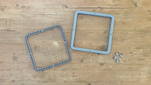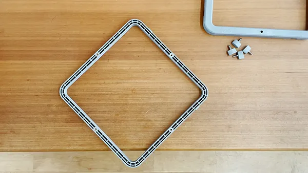 遮光のためマットをかぶせ、ネジをしめます。一度に締め切らず、全体を少しずつ均一にしめていくとシワがよりにくいです。