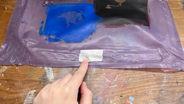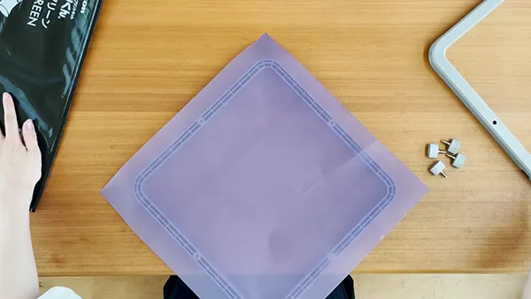 クオリティの高いプリントのためには、スクリーンの張りの強さが重要です。フレームにスクリーンを張る際、たるみがないようにピンと張るために、まず、フレームの内枠を机から少しはみ出して置き、空気の通り道を作ります。