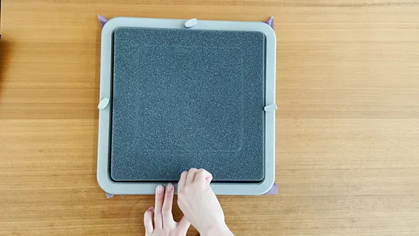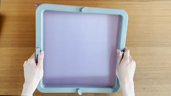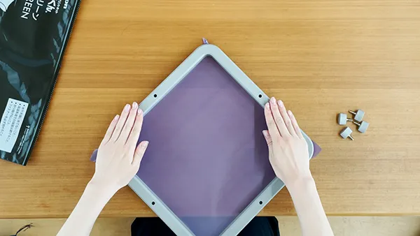 内枠の上にスクリーンをかぶせます。その上に外枠をのせて、上から抑え、勢いよくシュッと挟みます。