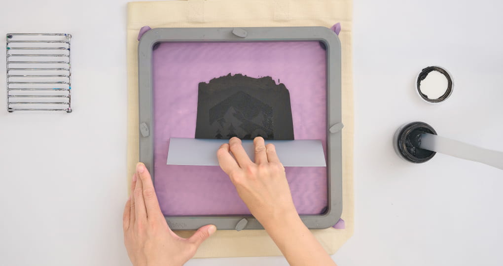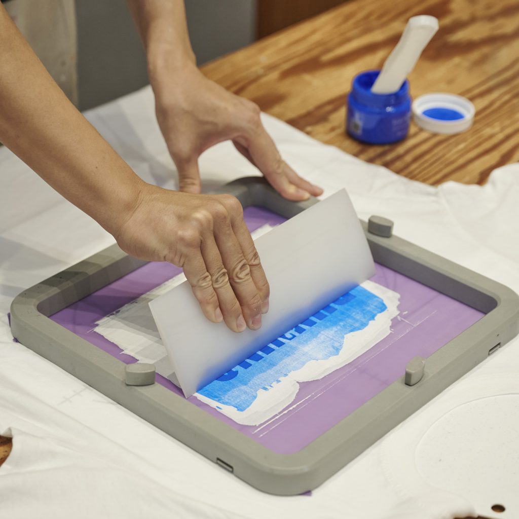 「スキージ」と呼ばれる道具を使って、インクを版の上から一気に滑らせることで、インクが孔を通って生地に落ち、プリントができます。