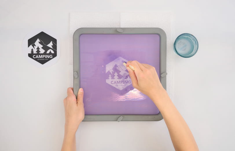 露光後、スクリーンを水で洗い流します。光が当たらなかったデザイン部分の乳剤が溶け落ち、インクが通る「孔(あな)」が開きます。