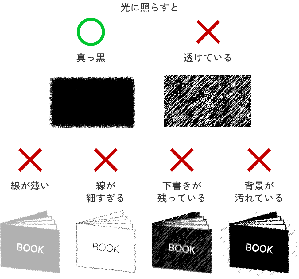 デザインは黒1色で作るのが基本です。印刷したい部分を黒く塗りつぶします。線幅は1mm以上の太めがおすすめです。