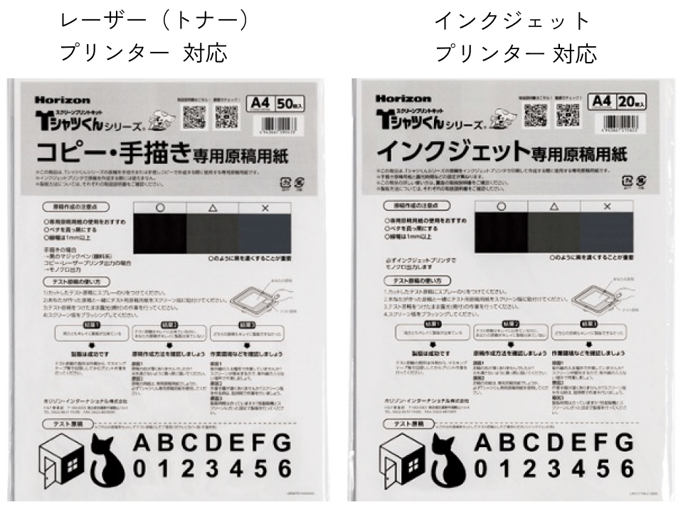 Tシャツくん 細い線、小さい文字、どこまで再現できる?【製版編】の記事につづく第二弾! 今回はプリント編です。 製版編の実験では、1pt未満の細い線、および明朝体の文字は、そもそもTシャツくんでは製版が難しい ということがわかりました。 https://www.hando-horizon.com/labo/11282 製版編はこちら さらに、製版できたからと言ってきれいにプリントができるとは限りません。 快適にシルクスクリーンを楽しむには、実寸1㎜以上(データの場合は線幅3pt以上)を推奨しています。 なぜ実寸1㎜以上が推奨なの? シルクスクリーンは、版の孔(あな)にインクを通すことでプリントする仕組み。 細かいデザインはその分版の孔も狭くなります。そうすると、インクが十分に落ちず印刷面がカスレたり、インクが孔をふさいで乾燥し目づまりを起こす原因となってしまうのです。 とは言え、できるだけ細かい線で表現したい…!ということもあると思います。 そこで今回は、Tシャツくんで製版した細い線や小さい文字はどこまでプリントできるのか、 実験を通して検証していきます。 実験ではこちらの図案を使いました。 今回使用した図案 ◎目次① 素材別 ・紙(クラフト紙) ・布(綿100%薄手) ・厚手コットン地② 何枚まで連続プリントできる? ・プレーンインクで実験 ・リッチインク「きん」で実験③ まとめ ① 素材別 それぞれ・標準スキージ1回刷り・120メッシュ・プレーンインクでプリントしてみました。 ※実寸1㎜=2.83pt 【紙(クラフト紙)】 ・線黒線も白抜き線もくっきりとプリントすることができました。 ・文字14ptはキレイに出ました!12pt以下は、若干潰れたりカスれたり。特に白抜き文字は、 クラフト紙の繊維にインクが滲んで潰れてしまいました。 クラフト紙にプリント 【布(綿100%薄手)】 ・線黒線、白抜き線どちらも細かい線までしっかりと出ています。 ・文字シャープにプリントできました!ただし、目の粗い生地の場合は生地の繊維にインクが滲んで読みづらくなる可能性がありますのでご注意ください。12pt以下は読めなくはないですが、許容範囲か否か見極める必要がありそう。14ptは安定しています◎ 薄手の布にプリント 【厚手コットン地】 ベタ面がカスレてしまったのは置いといて…(そもそも標準スキージは厚手コットンプリントは苦手!) ・線1ptの線はよく見るとムラがあります。1.5pt以上の線はくっきりとプリントできました! ・文字どれもだいぶ怪しいですね…。ただでさえカスレが出やすいので、14ptでも完璧とは言えない仕上がりです。 厚手コットン地は、細いデザインをキレイにプリントするのは難易度が高そうです。 厚手コットンにプリント ② 何枚まで連続プリントできる? さて、上記はすべて1刷り目のサンプルでした。1刷り目はスクリーンがキレイな状態なので、プリントも成功しやすいのです。2回目3回目…と刷っていくと、徐々にインクが乾いて目づまりが発生してきます。そこで次は、版の掃除なしで何枚まで連続プリントができるのか実験をしてみました。 ※注意点※実験は事前準備や加湿器のセット、エアコンの向きを調整した環境で行いました。次のプリントまでにかかる時間や部屋の湿度によって乾燥の速度が変わりますので、ご注意ください! ・プレーンインクで実験 Tシャツくんシリーズのスタンダード〈プレーンインク〉は、乾燥速度を遅らせているので水性インクでありながら目づまりしにくく扱いやすいインクです。 https://www.hando-horizon.com/labo/7501 インクについて詳しくはこちらの記事をご参照ください! 【黒線】 正直、10刷りが限度かな…と予想していましたが、15刷り目もそこそこいい感じに! 意外にも長く持ちこたえてくれました。 16刷り目以降、2pt以下の線はカスレが目立ち始めましたが、この程度であれば版の掃除で回復できます。※版の掃除方法はYouTube動画でもご紹介しています。 黒線実験 【白抜き線】 16刷り目でも安定していて、まだまだ刷り続けられちゃいそうです! 白抜き線実験 続いて文字の実験結果を見ていきましょう。 【黒文字】 文字自体の線が細すぎるのでインクが十分に落とせず、カスレてしまいます。 Tシャツくんで文字をプリントする場合は14pt以上にするかフォントを太くするのがオススメです。 黒文字実験 【白抜き文字】 なかなかイケてるのではないでしょうか?!上の黒文字よりも可読性はいい気がします。 よく見ると画数の多い文字は潰れているので、黒線同様フォントのサイズや太さを調整した方が、よりキレイなプリントになるはず。 白抜き文字実験 ・リッチインク「きん」で実験 リッチインクの「きん」「ぎん」はインクの中にラメの細かい粒子が含まれているので他の色に比べ目づまりしやすいインク。 そのため、「きん」「ぎん」を使用する場合はなるべく大きいデザインで、スクリーンは80メッシュを推奨しています。 今回はプレーンインクと同じ条件で比較をするため120メッシュを使用しています。 【きん線】 1ptの線は1刷り目