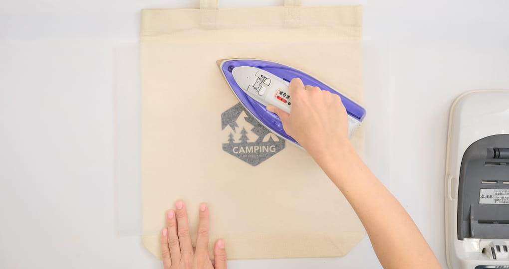 インクを完全に乾燥させた後(自然乾燥もしくはドライヤー)、必ずアイロンやヒートプレス機で熱を加えます(インクの種類により温度・時間が異なります)。