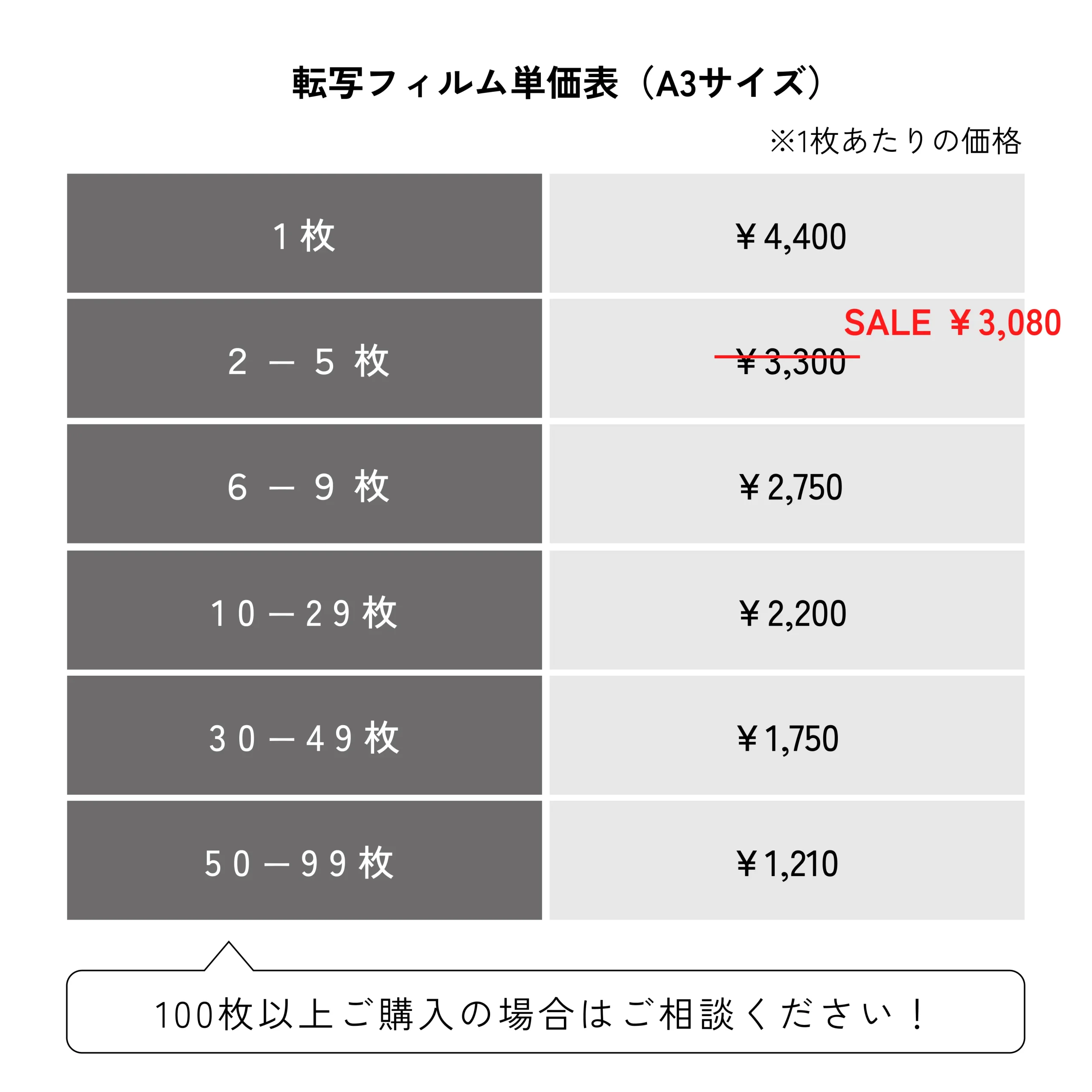 価格はA3サイズ1枚で4,400円(税込)。A3サイズ(297x420mm)内であれば複数のデザインを面付できるので、1デザインあたりのコストは安くなります。さらにまとめ割引もあります!2枚以上のご注文で1枚当たりの価格がぐっとお得に!