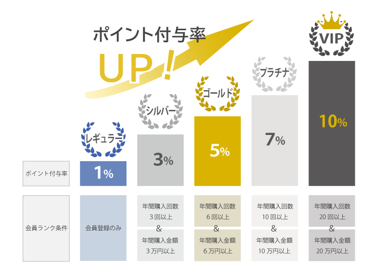 直営ECサイトHANDo WEBSHOPでは、過去1年間の「ご購入金額」と「ご購入回数」に応じて、ポイント還元率がどんどんアップする仕組みをご用意しています。